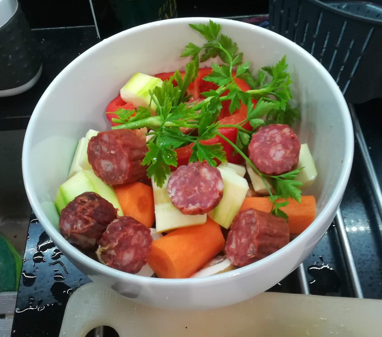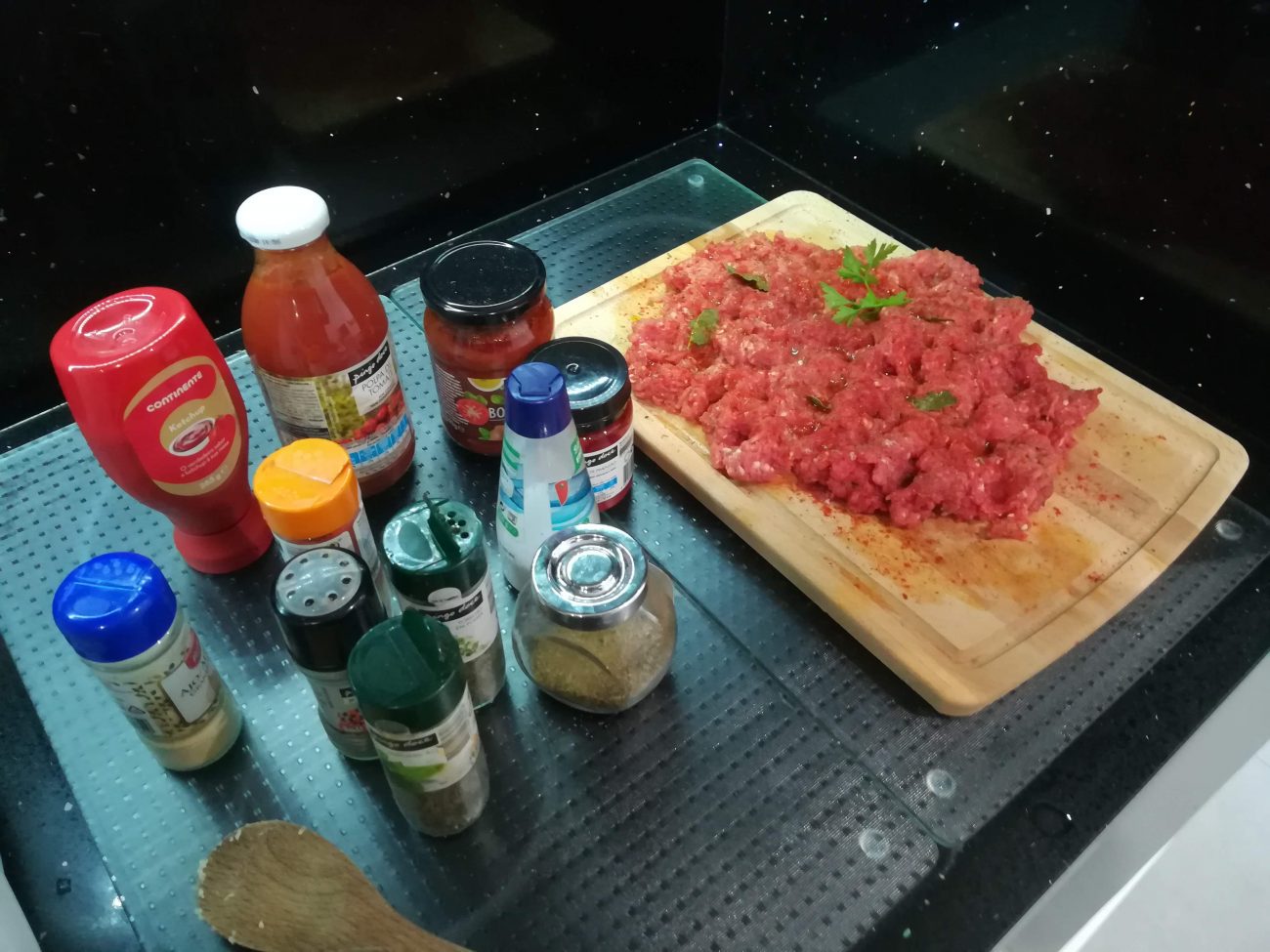 Retire o louro da carne e junte a carne ao tacho e envolva bem juntando a polpa de tomate, o ketchup, o açucar e o vinho branco e deixando cozinhar mais 5 minutos. Prove para ver se está bom de tempero. |